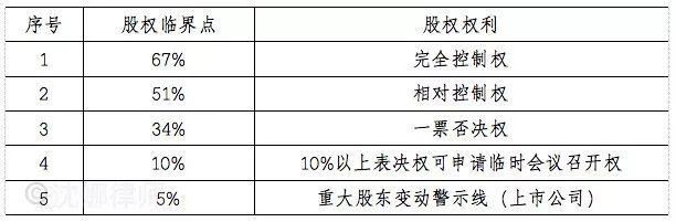 67%、51%、34%、10%,这四个比例经常出现在公司股权结构中,这就是股权临界点(5%临界点适用上市公司信息披露)。