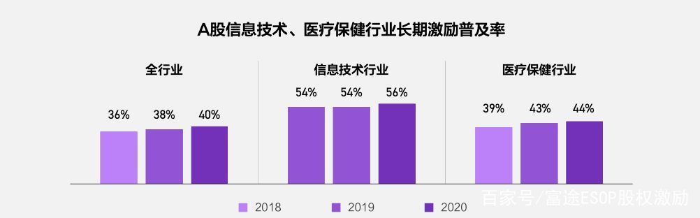 作为2020年两大热门行业,A股信息技术、医疗保健行业连续三年的长期激励普及率均高于市场水平。2020年A股全行业长期激励的普及率为40%,信息技术行业及医疗保健行业的长期激励普及率水平达56%和44%。