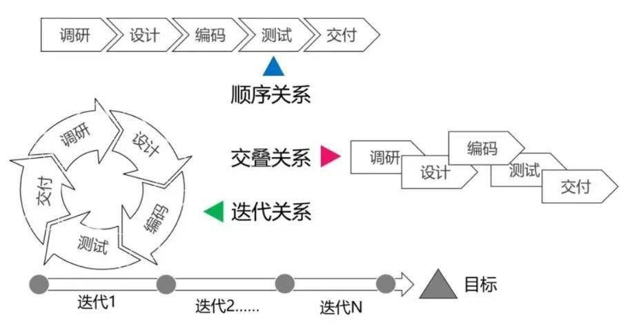 把项目切分成阶段之后,就需要关注阶段和阶段之间的关系,这些关系可以分为三种基本关系:顺序关系、交叠关系和迭代关系。无论是迭代还是交叠实际上都是在顺序的基础上进行的某种适应性调整。这种不同的调整方式演化出了各种各样的生命周期模型。